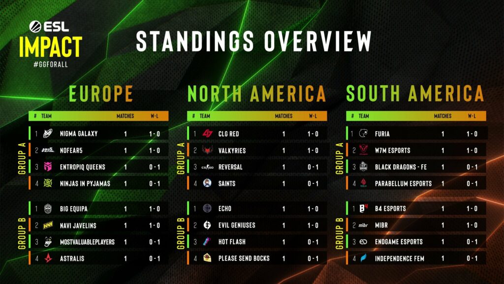 It wasn’t too surprising to see many of the favourites take their opening games. The more established rosters – particularly those from the ESL Impact Season 1 Finals and ESL Impact Valencia finals – looked confident, but the scorelines show this season looks to be incredibly competitive! Considering it was also the debut of quite a few teams in this first week, and there’s still plenty of time to see what these teams can do as the weeks progress. Our standings following week 1 look as follows: