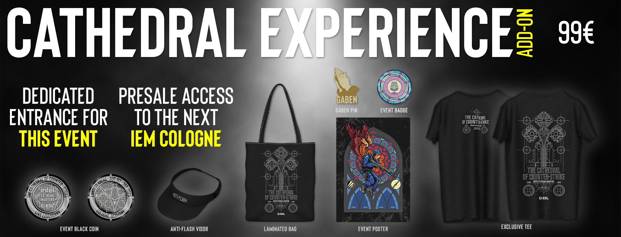 Get exclusive merch, dedicated entrance to the arena and presale access for the next IEM Cologne event, all with the Cathedral Experience add-on!
